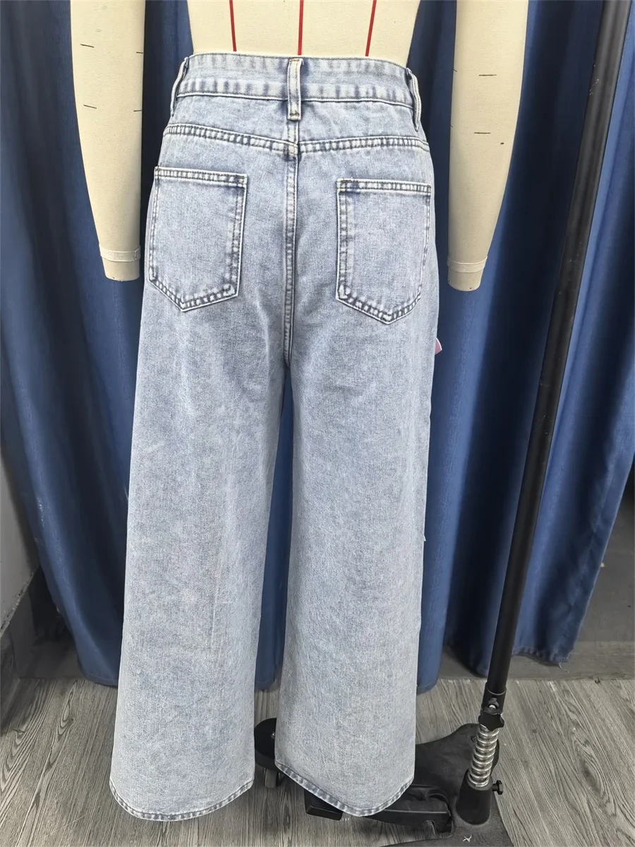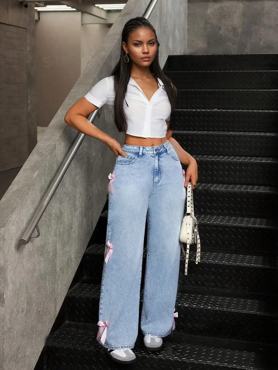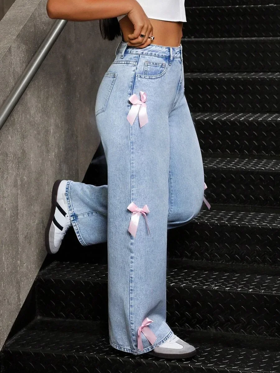 Jeans Wide Leg Azul Claro con Moños Decorativos