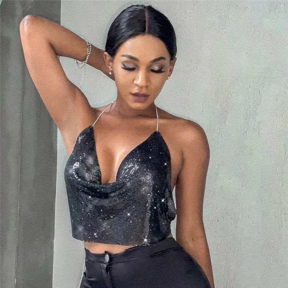 Top Halter Brillante con Lentejuelas de Metal sin Mangas – Espalda Abierta para Fiesta y Club Nocturno